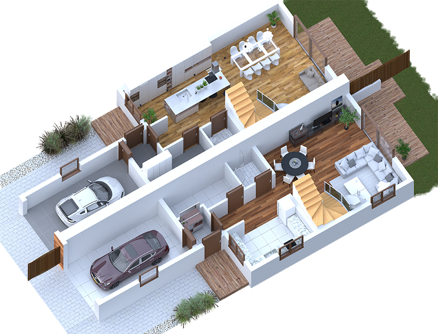 Oferowane mieszkania cechują się przemyślanym i funkcjonalnym rozkładem, przy jednoczesnym zachowaniu atrakcyjności cenowej. Powierzchnia każdego segmentu wynosi 99m2 powierzchni użytkowej oraz 131 m2 powierzchni całkowitej. Układ pomieszczeń został tak zaplanowany aby posiadał duży, przestronny, nasłoneczniony salon o powierzchni 30m2 wraz z kuchnią o powierzchni 10m2, toaletę, kotłownię wraz z pralnią oraz garaż o powierzchni 20m2 (z przejściem do wiatrołapu).